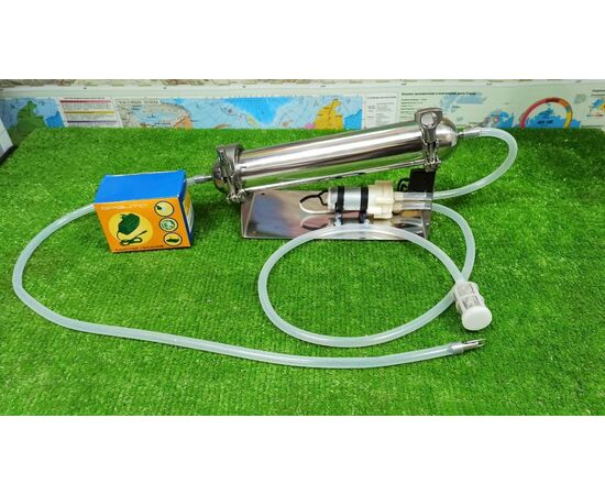 Использовать фильтр очень просто: Картридж устройства заполняется кокосовым углем. Готовый дистиллят заливаем в какую-нибудь емкость. Опускаете в емкость оба шланга и включаете насос. Продукт начинает циркулировать через фильтрующее устройство, очищаясь и смягчаясь.